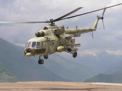 Despegue de un MI-8 o quizás un Mi-17MTV, (la verdad es que cuesta distinguirlos exteriormente), desde un enclave montañoso en la región de Saratov, el 26 de Mayo de 2.005. Nótese el disipador de calor "a la afgana" montado en la tobera. Es un sistema defensivo contra misiles de guia infrarroja.